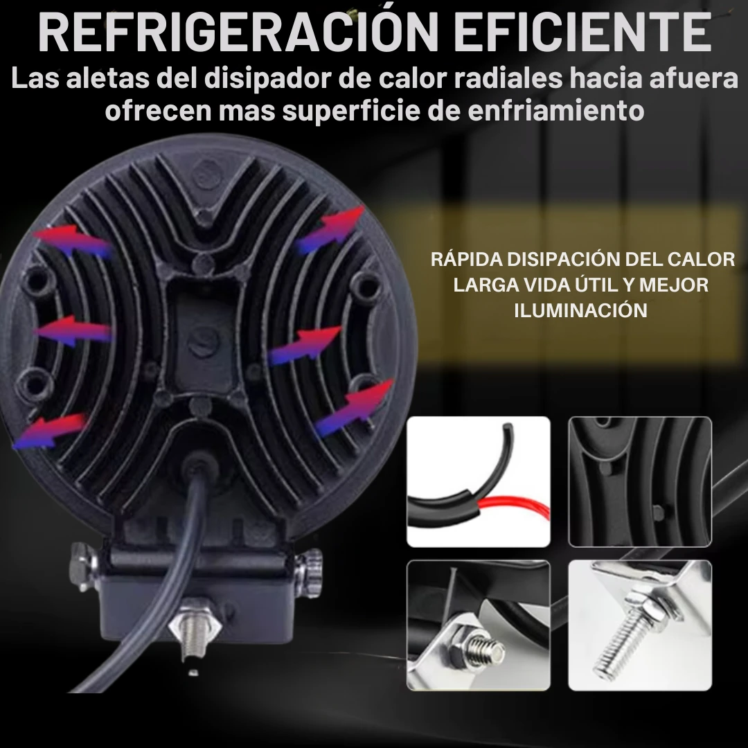 Las luces de trabajo LED están hechas de disipadores de calor de aluminio fundido engrosados, maximizan el área de superficie para un enfriamiento óptimo y mejoran la larga vida útil de la luz de trabajo LED hasta 50.000 horas.