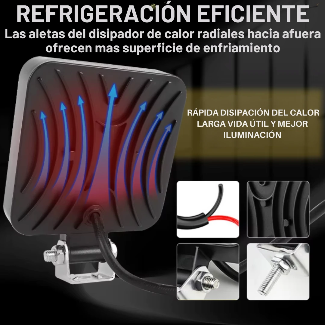 Las luces de trabajo LED están hechas de disipadores de calor de aluminio fundido engrosados, maximizan el área de superficie para un enfriamiento óptimo y mejoran la larga vida útil de la luz de trabajo LED hasta 50.000 horas.